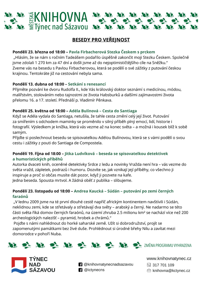Pro informaci uvádíme seznam besed a zajímavých setkání, která plánujeme uspořádat v prostorách Městské knihovny do konce roku 2026.