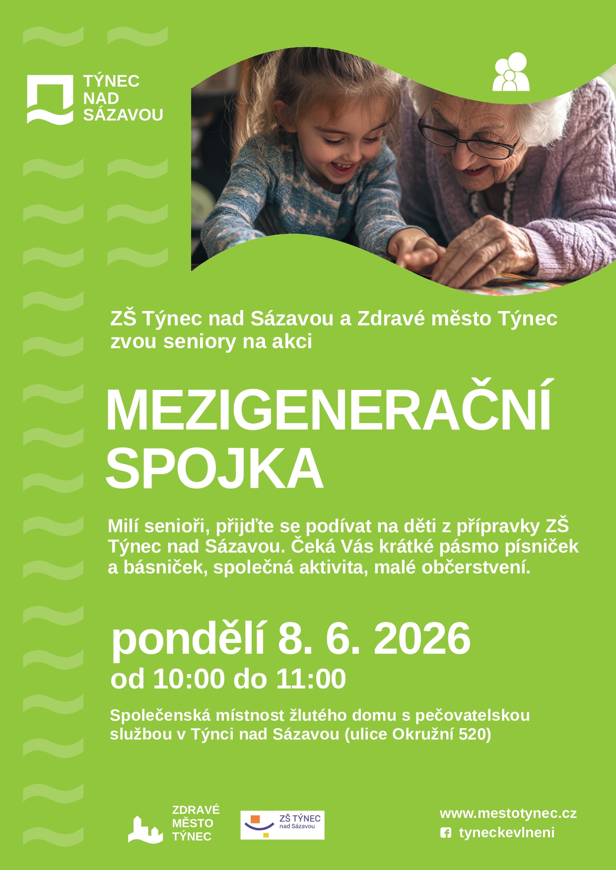 Detail: Zdravé město Týnec ve spolupráci se Základní školou Týnec nad Sázavou srdečně zve seniory na Mezigenerační spojku. Žáci přípravné třídy ZŠ Týnec nad Sázavou Vám přednesou krátké pásmo básniček a písniček. Čeká Vás i zábavná společná aktivita i malé občerstvení. Těšíme se na Vás.